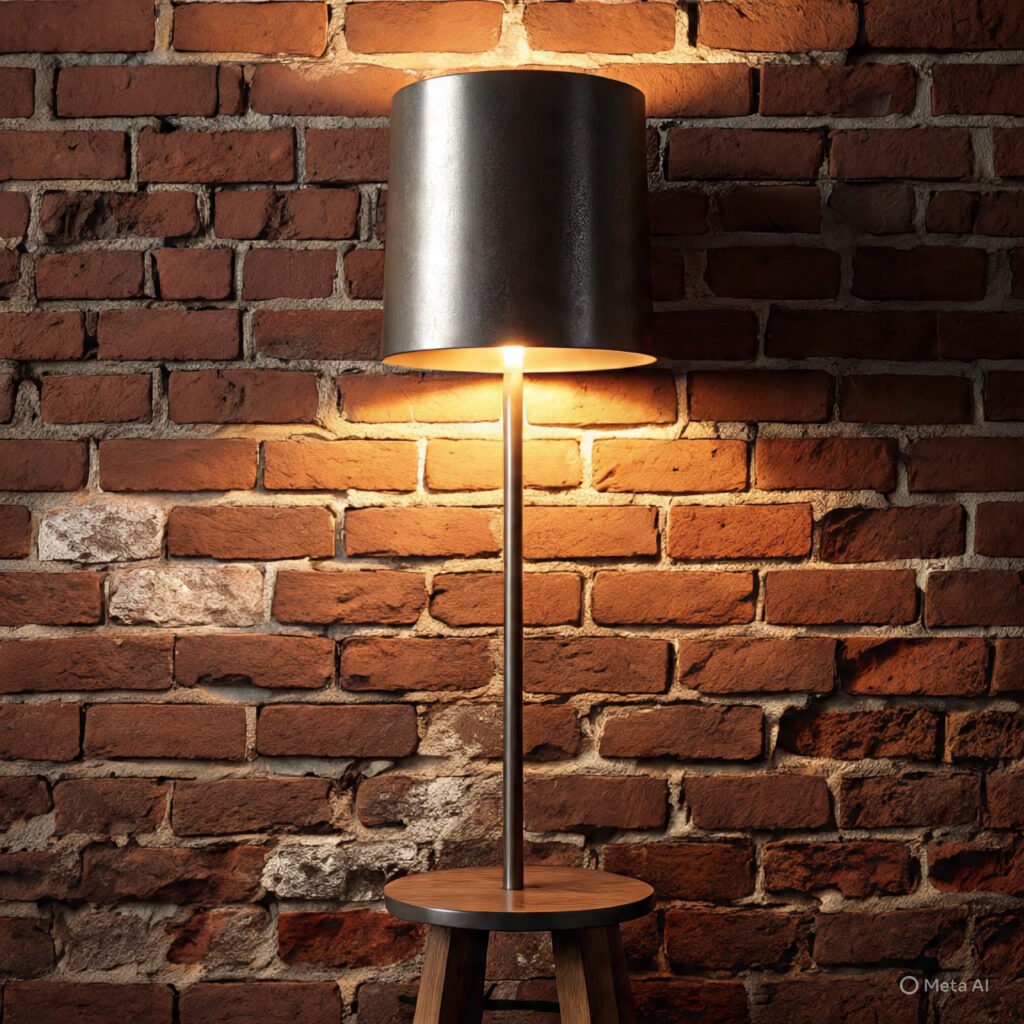 Lighting defines the atmosphere of an industrial living room. In this setup, a sleek black metal floor lamp stands against the brick wall, casting warm ambient light that enhances texture and depth.