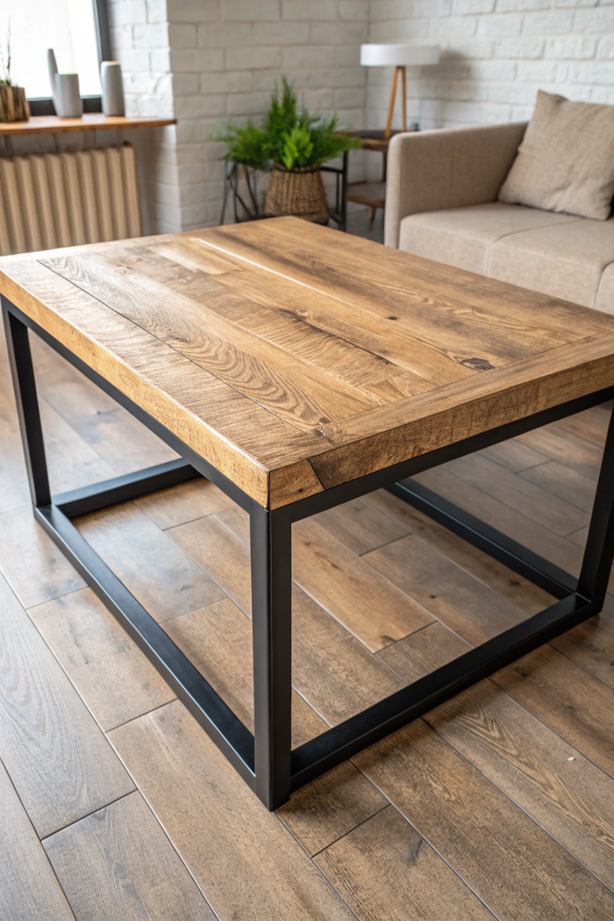 The rectangular coffee table combines natural wood planks with a matte black steel frame โ a classic industrial pairing.